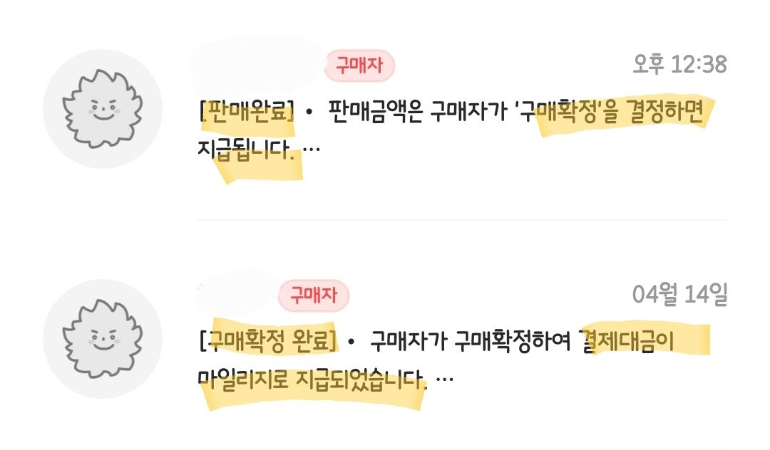 기프트콘 판매 시 판매 완료와 구매확정이 있는데, 상대가 구입하면 판매 완료로 뜨고 이후 구매자가 구매확정을 눌러줘야 내 아이디로 캐시가 들어오게 된다.