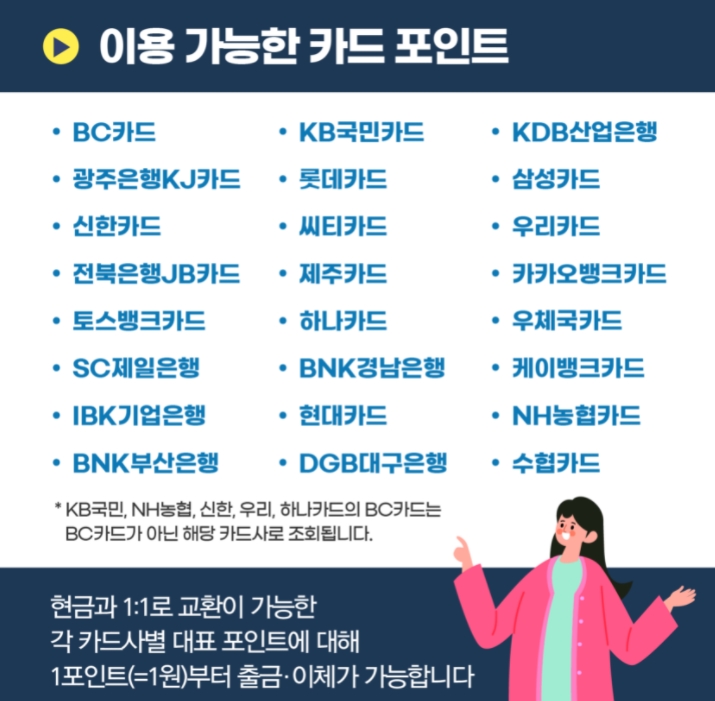 - 카드 포인트 계좌 입금 신청 완료 시 포인트 사용 및 즉시 입금 신청 처리가 되어 취소 및 정정이 불가하다